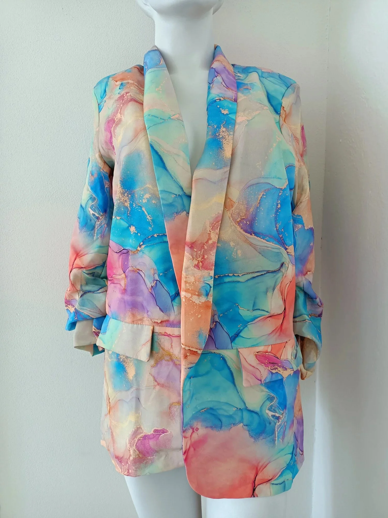 Dámské různobarevné sako se shrnutými rukávy.