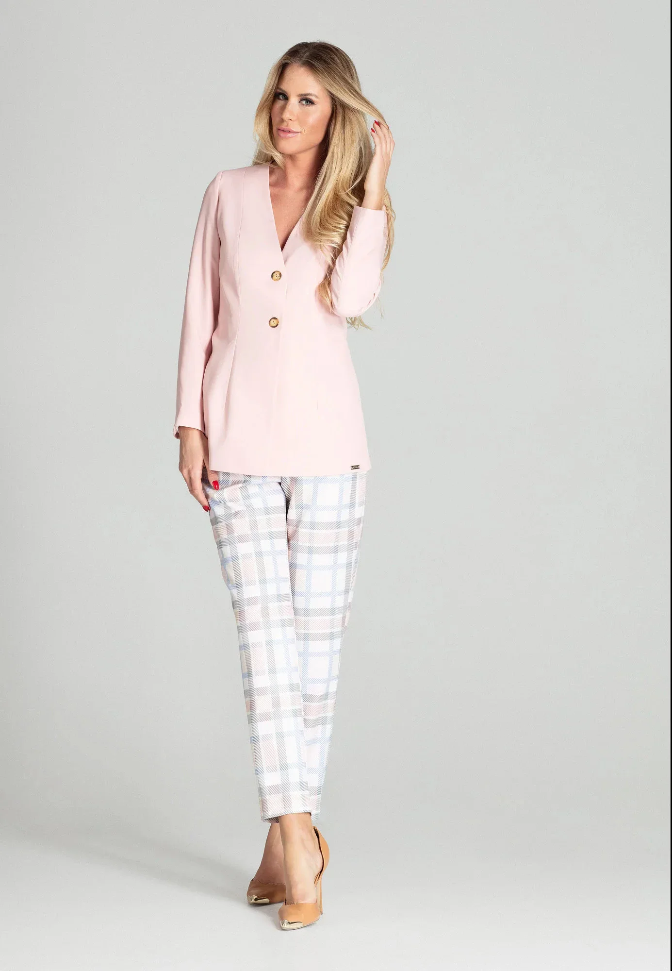 Světle růžový jarní prodloužený kabátek, podšitý. Výstřih do V, bez klop, bez kapes, zapínání na dva knoflíky.