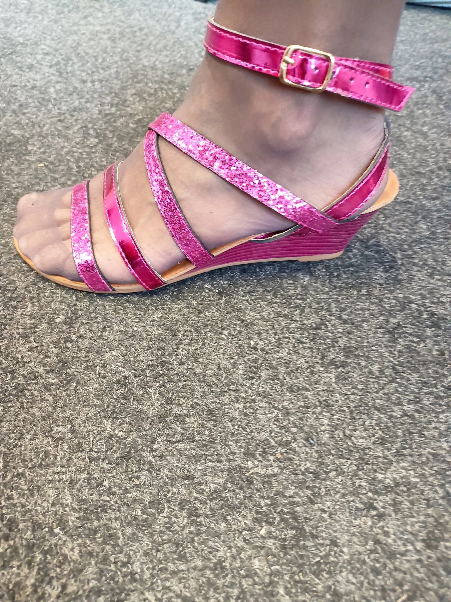 Dámské lesklé sandálky na klínovém podpatku.