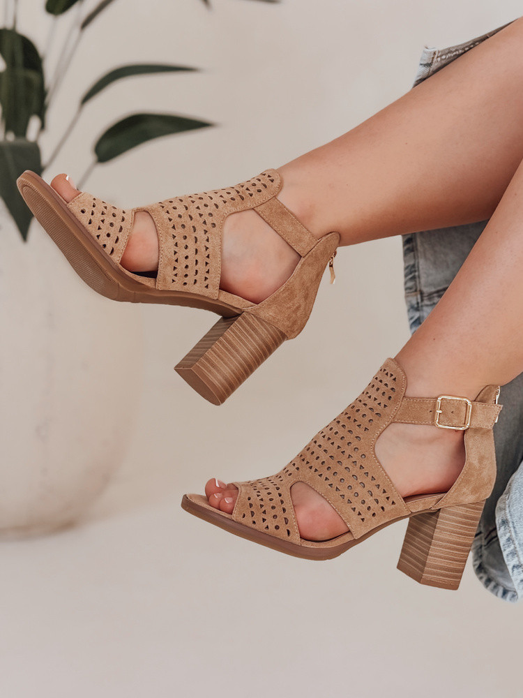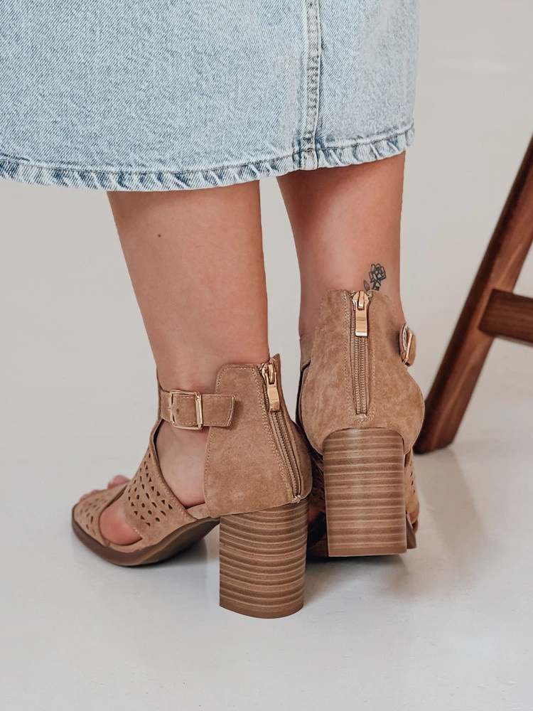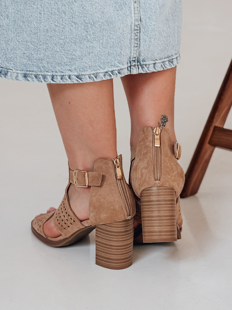 Dámské semišové sandály, které dodají šmrnc každému outfitu. Profilovaná podrážka a pevný 8cm jehlový podpatek zajišťují pohodlnou chůzi, zatímco jemná perforace ve svršku dodává lehkost a moderní vzhled. Nastavitelné zapínání umožňuje snadné obutí, díky čemuž se sandály hodí jak pro běžné nošení, tak pro zvláštní příležitosti.