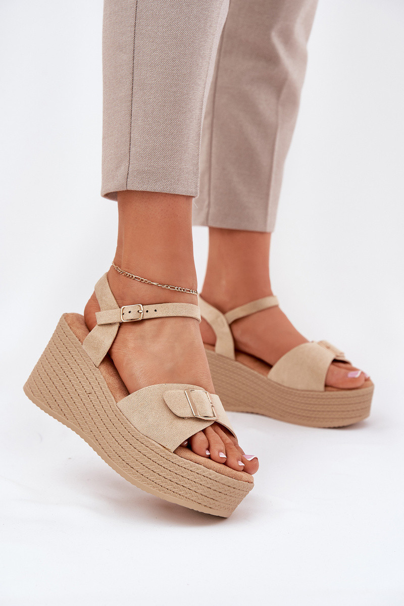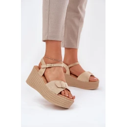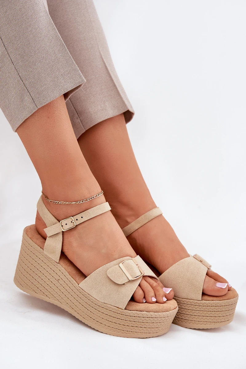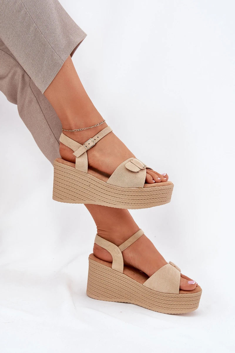Dámské sandály vyrobené z eko semiše. Umístěné na klínu a platformě s imitací pletení, poskytují pohodlí a stabilitu po celý den. Vepředu se nachází ozdobná spona, která jim dodává jedinečný charakter. Model se zapínáním na přezku umožňuje dokonalé přizpůsobení noze a měkká stélka zaručuje komfort. Tyto sandály budou dokonalým doplňkem letních stylizací. Při výběru velikosti se řiďte tabulkou velikostí.