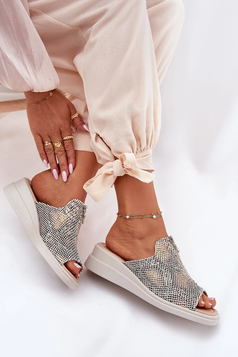 Dámské sandály z eko kůže, umístěné na klínu, jsou elegantní volbou na teplé dny. Model se vyznačuje ozdobným zipem, který dodává moderní charakter. Ideální pro letní stylizace, tyto sandály budou vynikající volbou k šatům, sukním nebo kalhotám, přidávající každému stylu lehkost a eleganci. Při výběru velikosti se řiďte tabulkou velikostí.