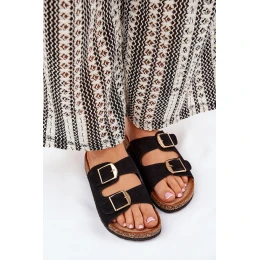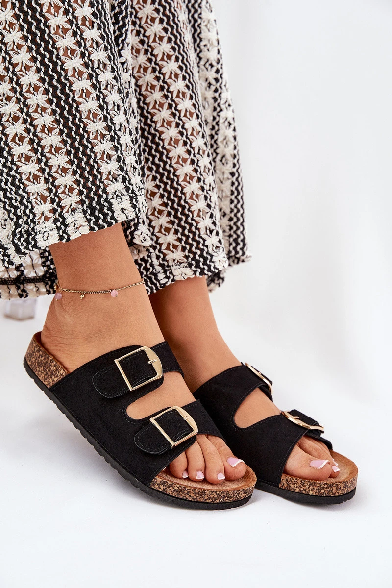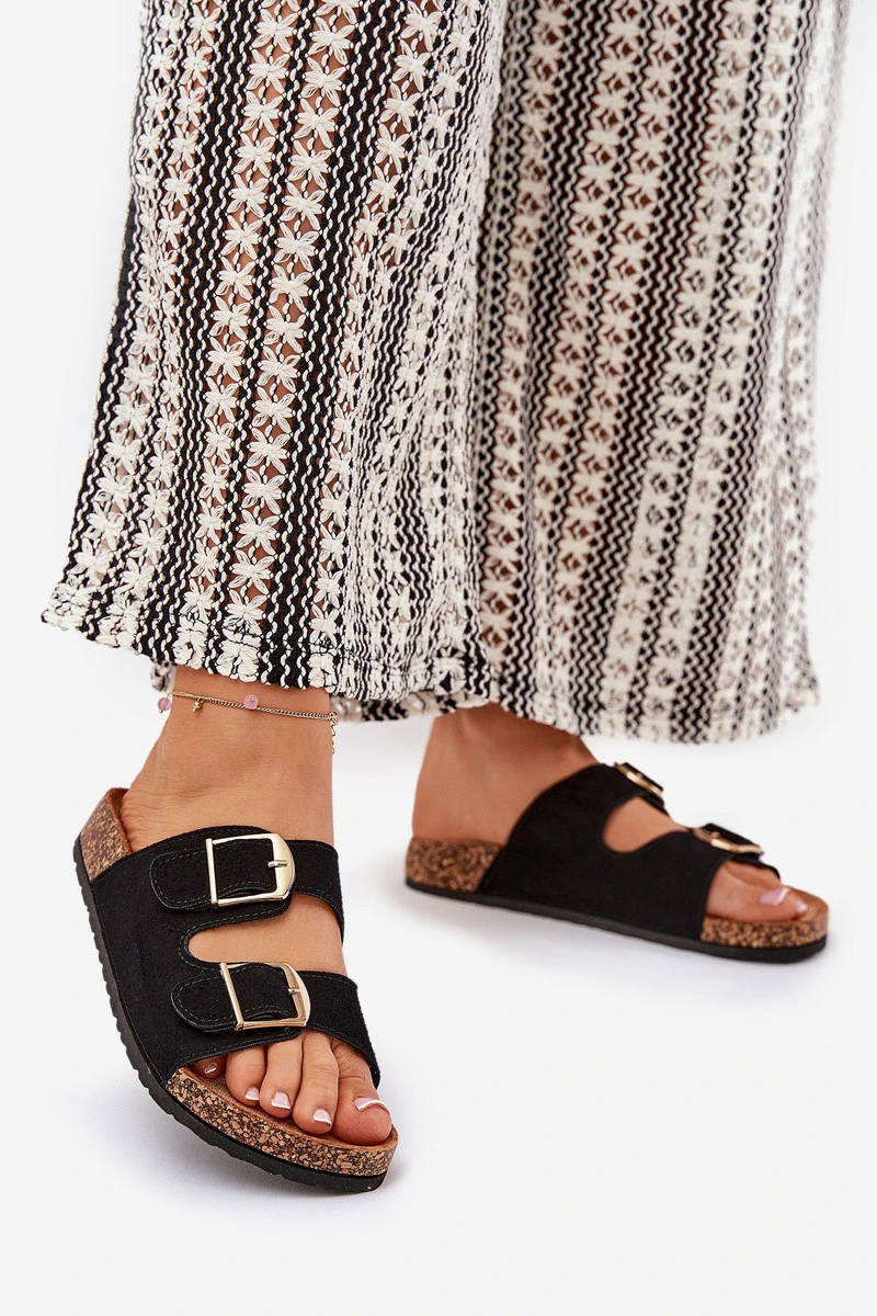 Stylové dámské pantofle na korkové platformě, které kombinují pohodlí s módním vzhledem. Vpředu se nacházejí dva pásky s přezkami, které zajišťují dokonalé přizpůsobení. Profilovaná eko semišová stélka zaručuje komfort po celý den. Tyto pantofle budou skvělou volbou na letní dny, skvěle se hodí k šatům, sukním a kalhotám. Při výběru velikosti se řiďte tabulkou velikostí.