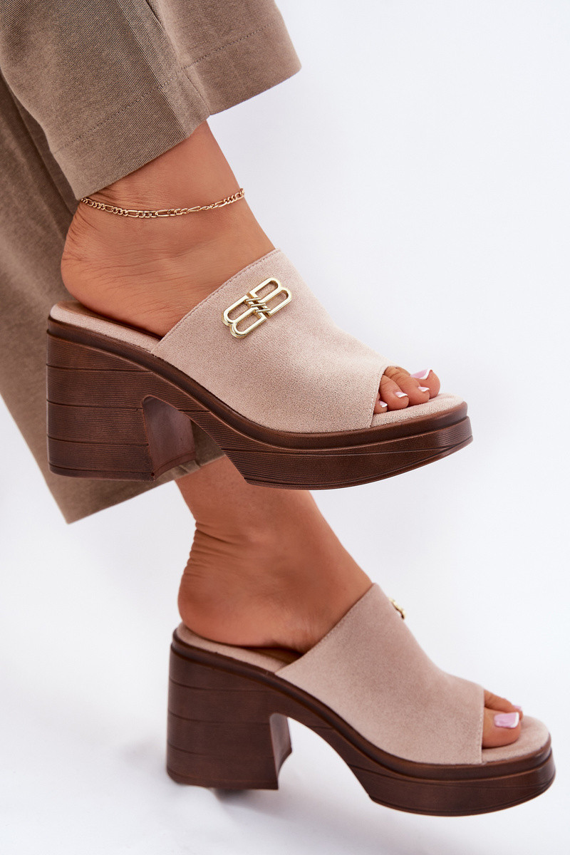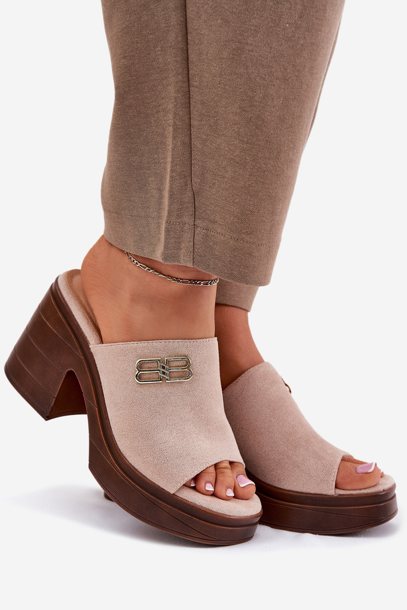 Elegantní dámské pantofle vyrobené z eko semiše jsou ideální volbou pro výjimečné příležitosti. Zlatý detail vpředu jim dodává jemný lesk a elegantní charakter. Uloženy na masivním podpatku a platformě, zajišťují stabilitu a pohodlí po celý den. Tyto pantofle kombinují moderní vzhled s funkčností a skvěle se hodí k elegantním stylizacím na různé oslavy a večerní vycházky. Při výběru velikosti se řiďte tabulkou velikostí.