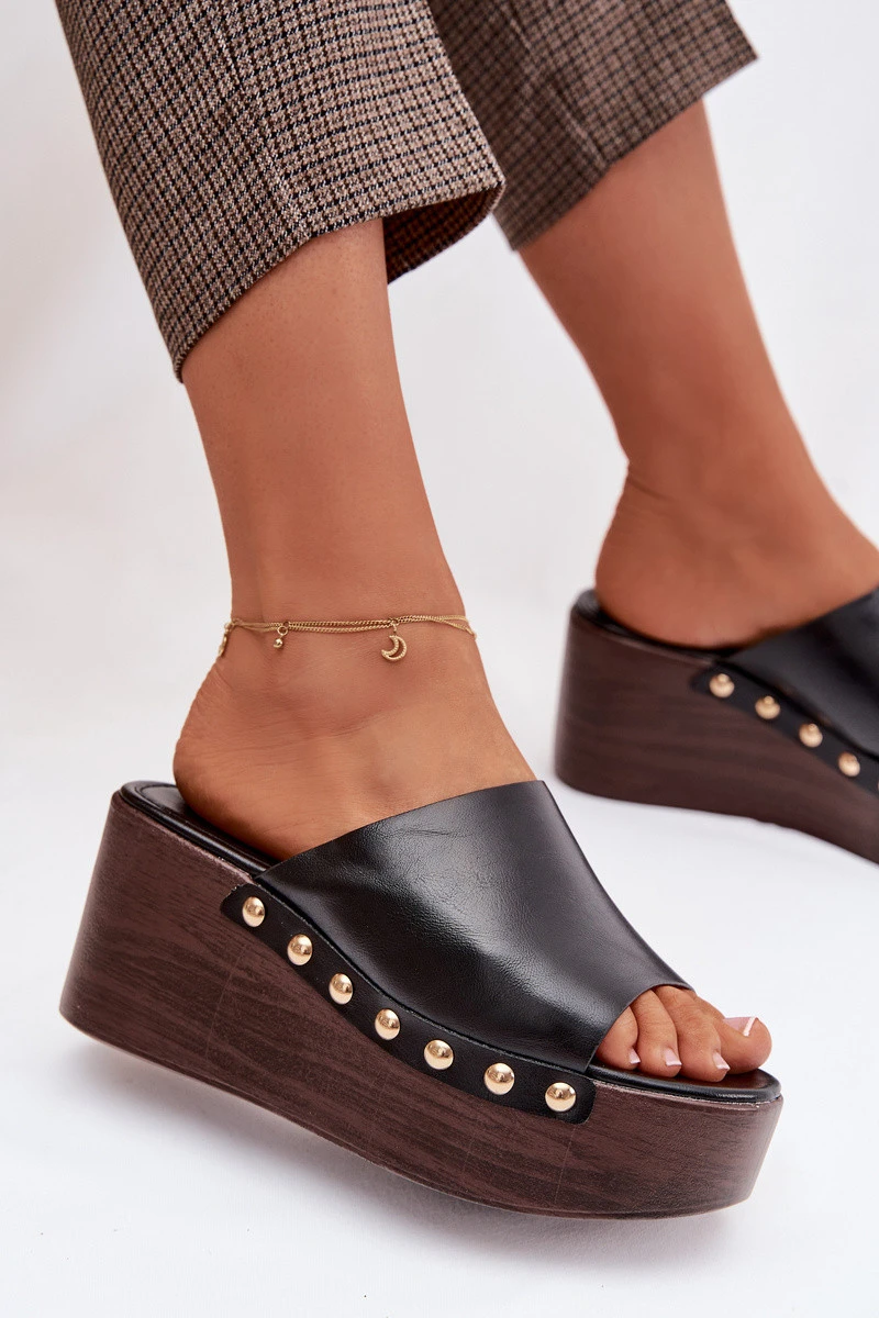 Stylové dámské nazouváky vyrobené z ekologické kůže jsou pohodlnou a efektní nabídkou na každodenní nošení. Podpatek spojený s platformou zajišťuje stabilitu a komfort při nošení, přičemž jemně zvýrazňuje siluetu. Zlaté nýty umístěné po stranách dodávají celku módní charakter. Model se skvěle hodí do letních stylizací – jak k šatům, tak k kalhotám či sukním. Je to ideální volba pro ženy, které ocení pohodlí spojené s výrazným stylovým detailem. Při výběru velikosti se řiďte tabulkou velikostí.