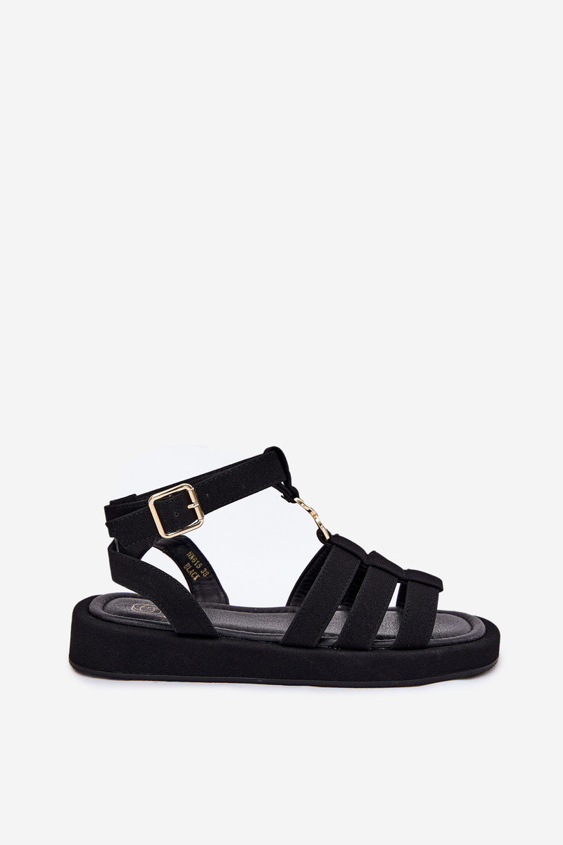 Dámské sandály vyrobené z eko semiše. Usazené na jemné platformě, poskytují pohodlí a stabilitu po celý den. Zapínají se na sponu s nastavitelným páskem, což umožňuje dokonalé přizpůsobení noze. Vpředu se nachází jemný zlatý detail, který spojuje pásky. Měkká stélka zajišťuje pohodlí při chůzi. Ideálně se hodí jak k šatům, tak k kalhotám, vytvářející stylový vzhled pro každou příležitost. Při výběru velikosti se řiďte tabulkou velikostí.