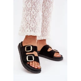 Dámské pantofle vyrobené z eko semiše. Uloženy na platformě. Dva nastavitelné pásky se zlatými sponami zajišťují dokonalé přizpůsobení, zatímco profilovaná stélka zaručuje pohodlí po celý den. Ideální na každodenní nošení. Při výběru velikosti se řiďte tabulkou velikostí.