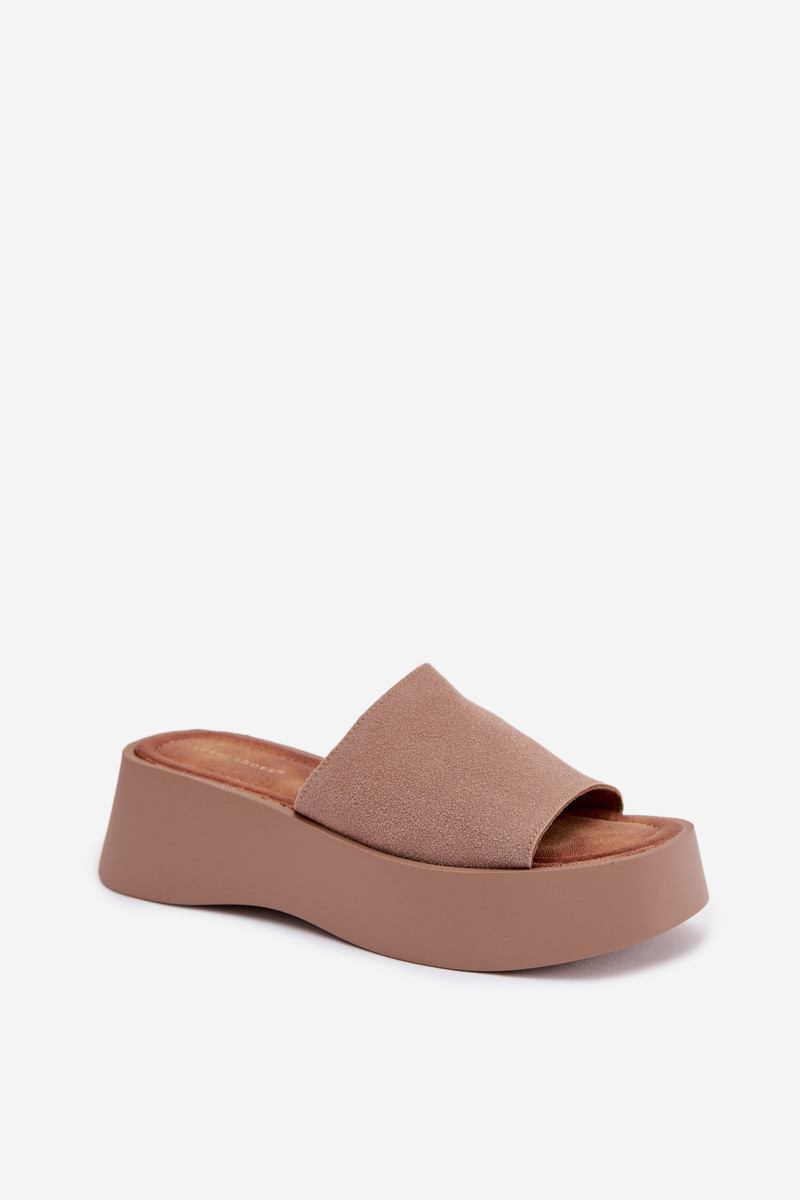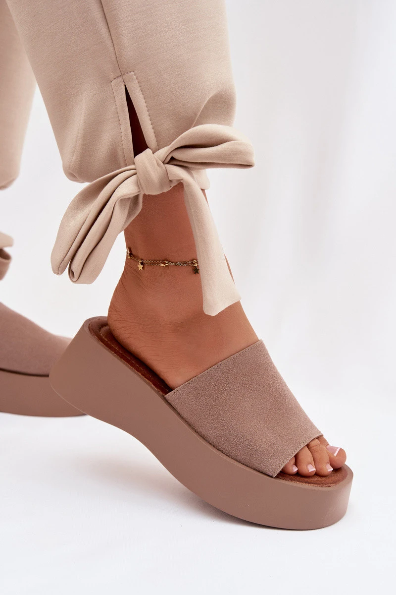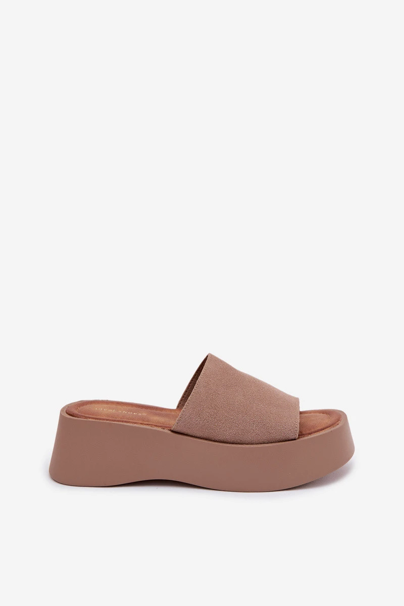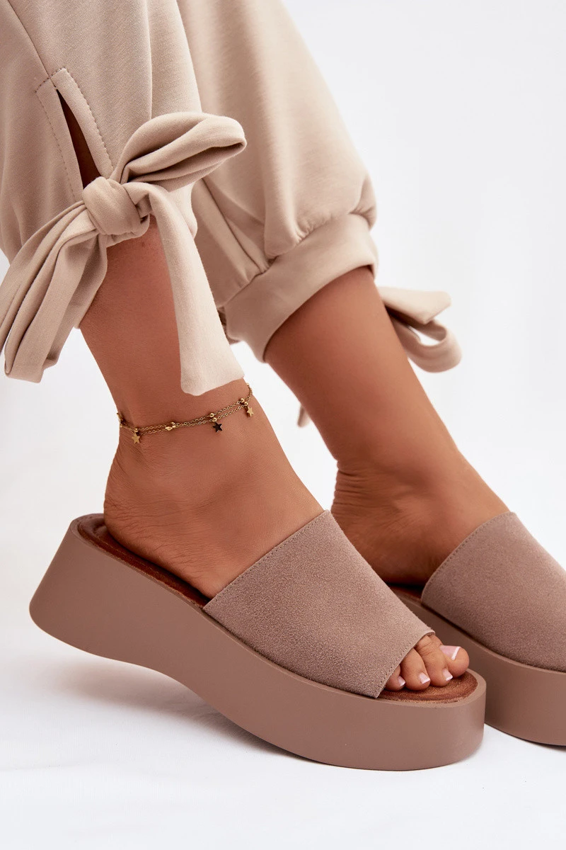 Dámské nazouváky na platformě jsou pohodlnou a stylovou volbou na horké dny. Pásek je vyroben z eko semiše. Měkká vložka zajišťuje pohodlí po celý den. Stabilní platforma mírně zvedá postavu, aniž by obětovala pohodlí. Tento model se skvěle hodí do každodenních letních outfitů. Při výběru velikosti se řiďte tabulkou velikostí.