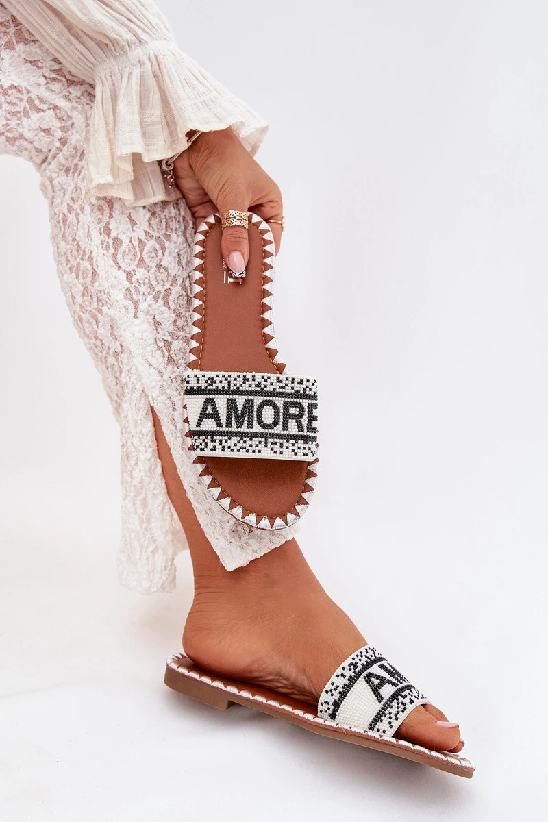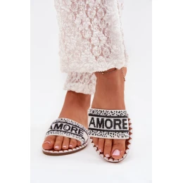 Dámské pantofle na plochém podpatku s ozdobným páskem "Amore". Ekokůže stélka zajišťuje pohodlí po celý den a stylový vzhled je činí vynikající volbou jak na běžné nošení, tak na večerní vycházky. Ideální k letním šatům, sukním nebo kalhotám. Při výběru velikosti se řiďte tabulkou velikostí.