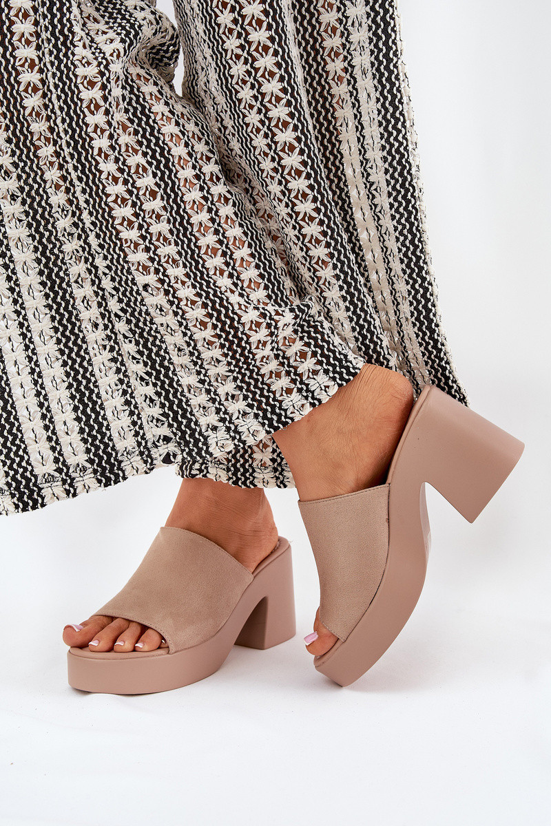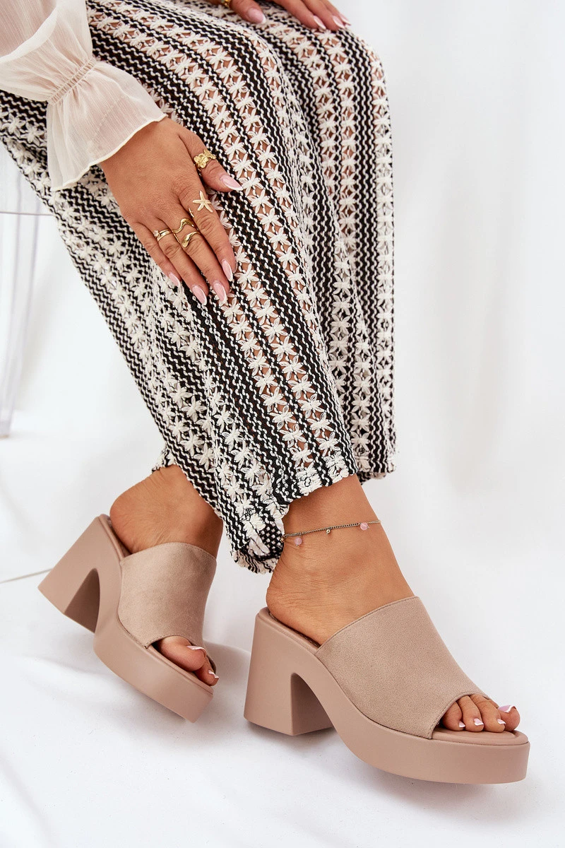 Dámské pantofle na platformě a sloupkovém podpatku, které kombinují pohodlí s módním vzhledem. Svršek je vyroben z eko semiše a měkká stélka zajišťuje pohodlí po celý den. Klasický střih činí tyto pantofle ideálními pro mnoho letních stylizací, přidávají eleganci a lehkost každému vzhledu. Ideální na každodenní vycházky i speciální příležitosti. Při výběru velikosti se řiďte tabulkou velikostí.