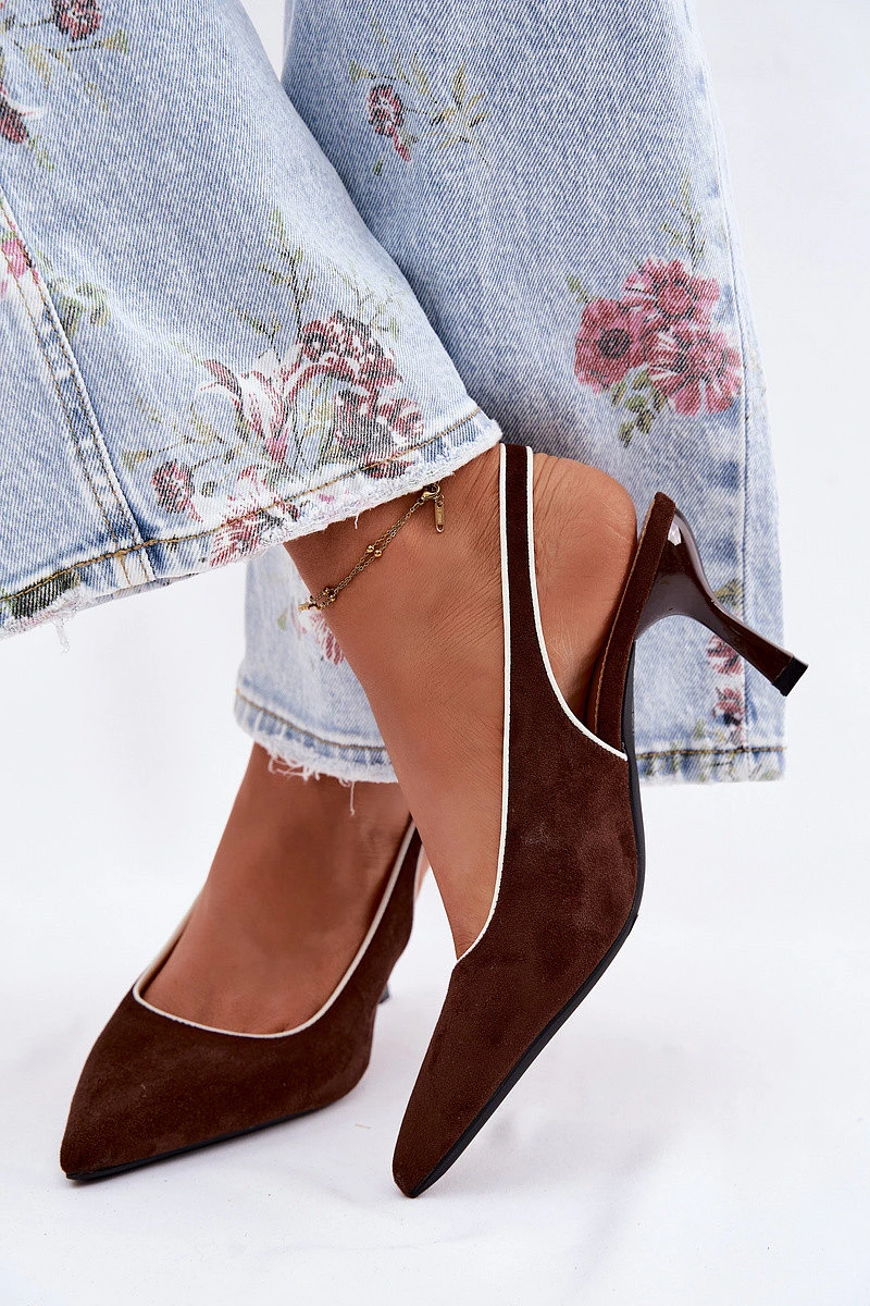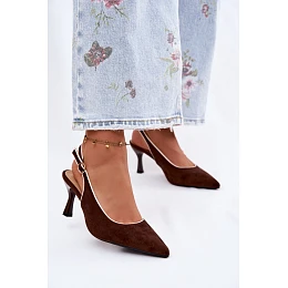 Dámské sandály z eko semiše jsou elegantní volbou pro ženy, které ocení styl a ženský charakter. Model se vyznačuje špičatými nosky, které opticky zeštíhlují nohu. Vrchní část je zakončena eko koženou lemovkou, která zdůrazňuje estetiku obuvi a dodává jí dokonalý vzhled. Tenký podpatek typu jehla krásně tvaruje siluetu, prodlužuje nohy a dodává lehkost každému outfitu. Zapínání na přezku s nastavitelným páskem umožňuje perfektní přizpůsobení noze a zajišťuje pohodlí při nošení. Ideální volba na elegantní vycházky, slavnostní příležitosti a večerní události. Při výběru velikosti se řiďte tabulkou velikostí.