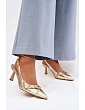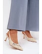 Dámské sandály vyrobené z eko kůže jsou stylovým návrhem pro ženské outfity. Uzavřené, špičaté špičky jim dodávají elegantní charakter a opticky zeštíhlují nohu, zdůrazňují štíhlou linii boty. Model je postaven na podpatku ve tvaru jehly, který dodává siluetě lehkost a ženský půvab. Zapínání na přezku s nastavitelným páskem umožňuje správné přizpůsobení noze, zajišťující stabilitu při chůzi. Vepředu jsou dva pásky a dekorativní přezka, které tvoří efektní detail a zdůrazňují stylový charakter sandálů. Ideální volba na výjimečné příležitosti a elegantní letní stylizace. Při výběru velikosti se řiďte tabulkou velikostí.