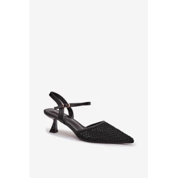 Dámské sandály vyrobené ze směsi ekologické kůže a textilního materiálu jsou stylovým doplňkem ženských outfitů. Kombinace materiálů zajišťuje estetický vzhled a pohodlí při nošení, díky čemuž se model skvěle hodí na různé příležitosti. Obuv je postavena na tenkém podpatku, který jemně zeštíhluje siluetu a dodává lehkost krokům. Špičaté špičky zdůrazňují elegantní charakter a pásek s přezkou a regulací umožňuje správné přizpůsobení noze. Tyto nápadné sandály skvěle doplní jak večerní, tak i elegantnější letní stylizace. Při výběru velikosti se řiďte tabulkou velikostí.