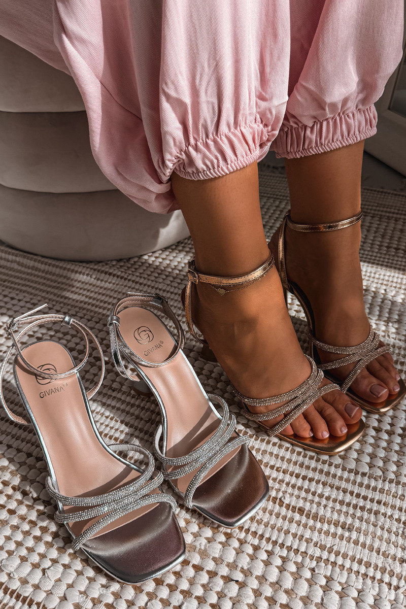 Dámské sandály s pásky zdobenými imitací zirkonií jsou elegantní volbou, která se skvěle hodí při výjimečných příležitostech. Jemně třpytivé detaily krásně odrážejí světlo, čímž dodávají stylizacím efektní, šperkařský charakter. Model na tenkém podpatku zvýrazňuje siluetu, opticky prodlužuje nohy a dodává celku lehkost. Zapínání na přezku s nastavitelým páskem umožňuje dokonalé přizpůsobení noze, zajišťující pohodlí a stabilitu při nošení. Ideální volba na večerní výlety, svatby a jiné oslavy – pro ženy, které chtějí vypadat stylově a přitahovat pohledy. Při výběru velikosti se řiďte tabulkou velikostí.