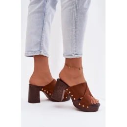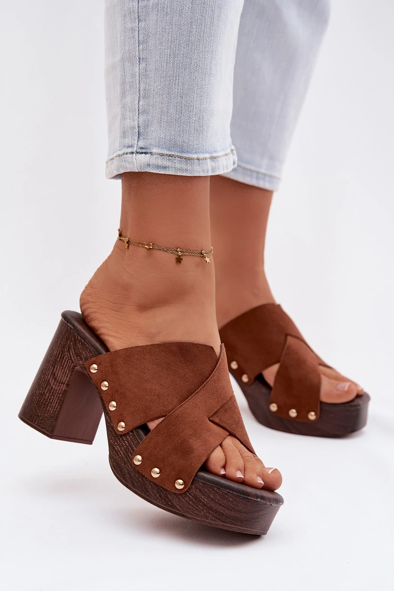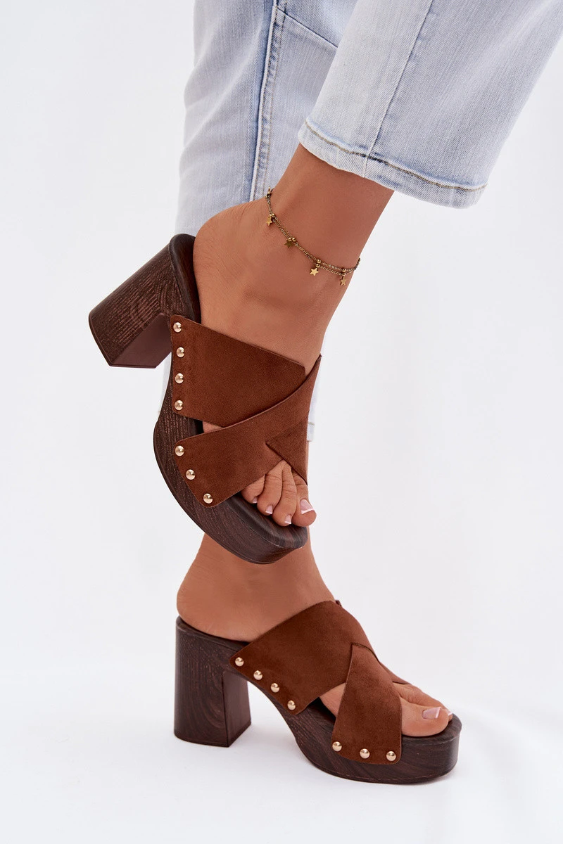 Dámské pantofle na podpatku typu sloupek a platforma jsou návrhem pro ženy, které mají rády výrazné detaily. Pásky vyrobené z eko semiše. Zlaté cvočky tvoří módní, poutavý akcent. Stabilní sloupek v kombinaci s platformou zajišťuje pohodlí při nošení a jistotu kroku, přičemž zdůrazňuje siluetu. Tento model se skvěle hodí do letních stylizací – jak na běžné nošení, tak na večerní výlety. Při výběru velikosti se řiďte tabulkou velikostí.