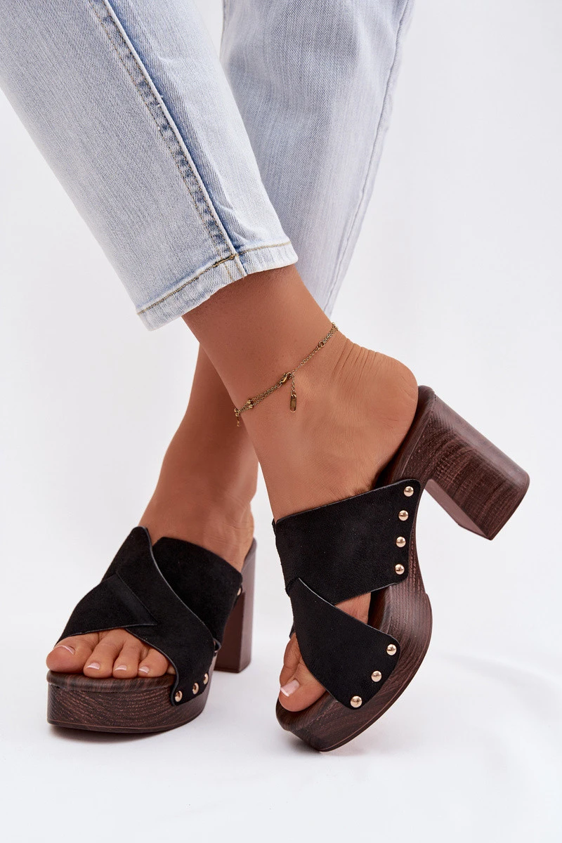 Dámské pantofle na podpatku typu sloupek a platforma jsou návrhem pro ženy, které mají rády výrazné detaily. Pásky vyrobené z eko semiše. Zlaté cvočky tvoří módní, poutavý akcent. Stabilní sloupek v kombinaci s platformou zajišťuje pohodlí při nošení a jistotu kroku, přičemž zdůrazňuje siluetu. Tento model se skvěle hodí do letních stylizací – jak na běžné nošení, tak na večerní výlety. Při výběru velikosti se řiďte tabulkou velikostí.