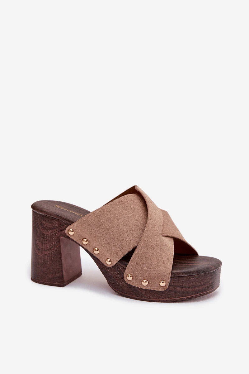 Dámské pantofle na podpatku typu sloupek a platforma jsou návrhem pro ženy, které mají rády výrazné detaily. Pásky vyrobené z eko semiše. Zlaté cvočky tvoří módní, poutavý akcent. Stabilní sloupek v kombinaci s platformou zajišťuje pohodlí při nošení a jistotu kroku, přičemž zdůrazňuje siluetu. Tento model se skvěle hodí do letních stylizací – jak na běžné nošení, tak na večerní výlety. Při výběru velikosti se řiďte tabulkou velikostí.