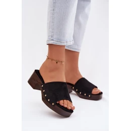 Dámské nazouváky vyrobené z ekologické semišové kůže jsou stylovým tipem pro ženy, které mají rády módní akcenty. Model na stabilním klockovém podpatku a platformě zaručuje pohodlí a jistotu kroku. Měkká vložka se stará o komfort nošení a zlaté nýty po stranách dodávají celku výrazný charakter. Tyto nazouváky se skvěle hodí jak do každodenních, tak i do elegantnějších letních outfitů. Při výběru velikosti se řiďte tabulkou velikostí.