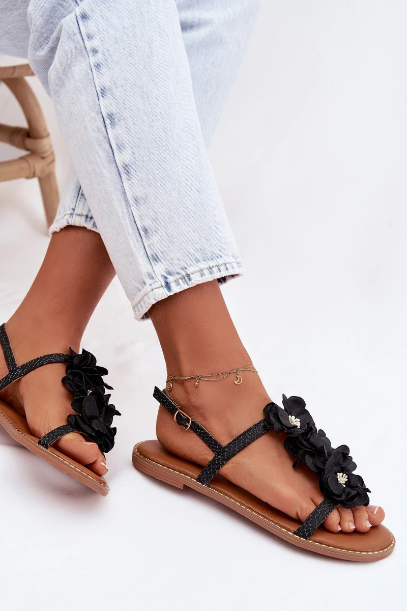 Dámské sandály Ploché S Dekorativními Květinami Černé Noemia
