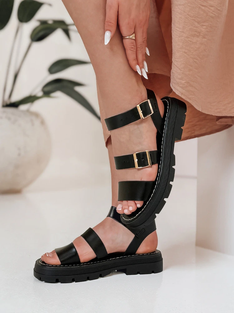 Sandały wykonane z ekoskóry, które łączą wygodę z miejskim stylem. Regulowane paski z metalowymi klamrami gwarantują stabilność i dobre dopasowanie do stopy. Wkładka zrobiona z ekoskóry. Gruba podeszwa o wysokości 3,5 cm zapewnia komfort chodzenia oraz świetnie sprawdza się zarówno na miejskich chodnikach, jak i podczas letnich wyjazdów.
