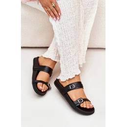 Dámské pantofle z eko kůže na jemné platformě jsou stylovým a pohodlným návrhem na teplé dny. Model se vyznačuje dvěma pásky s přezkami, které jim dodávají moderní charakter. Ideální pro každodenní stylizace, spojují pohodlí s módním vzhledem. Při výběru velikosti se řiďte tabulkou velikostí.