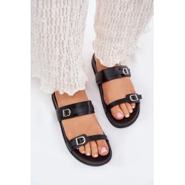 Dámské pantofle z eko kůže na jemné platformě jsou stylovým a pohodlným návrhem na teplé dny. Model se vyznačuje dvěma pásky s přezkami, které jim dodávají moderní charakter. Ideální pro každodenní stylizace, spojují pohodlí s módním vzhledem. Při výběru velikosti se řiďte tabulkou velikostí.