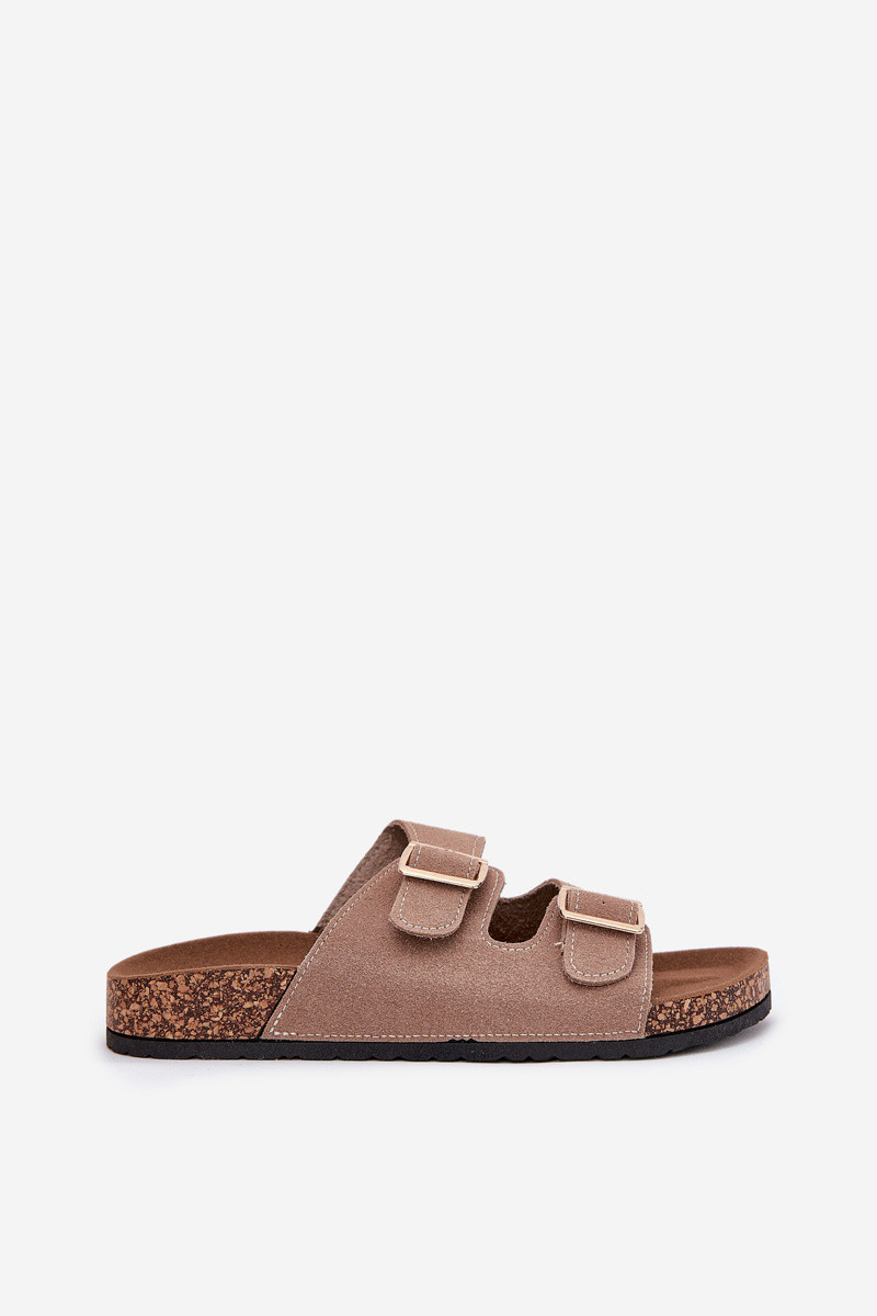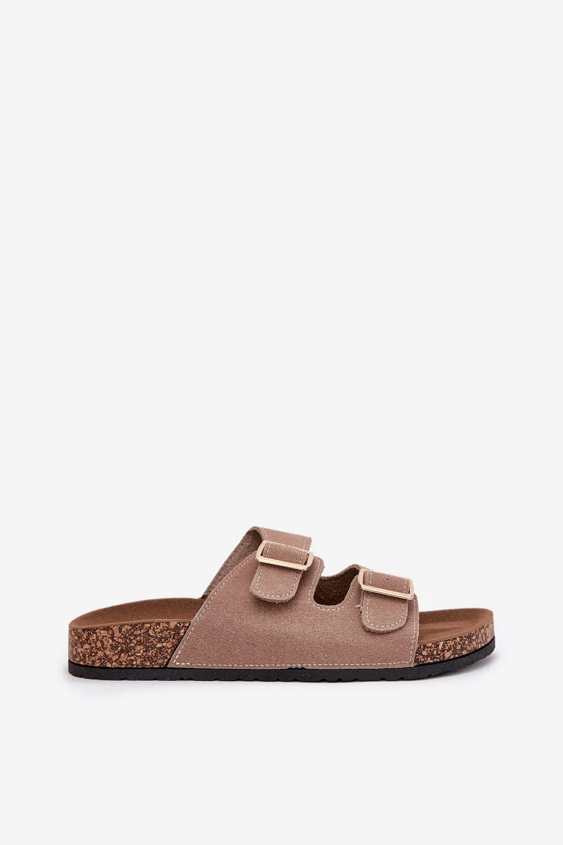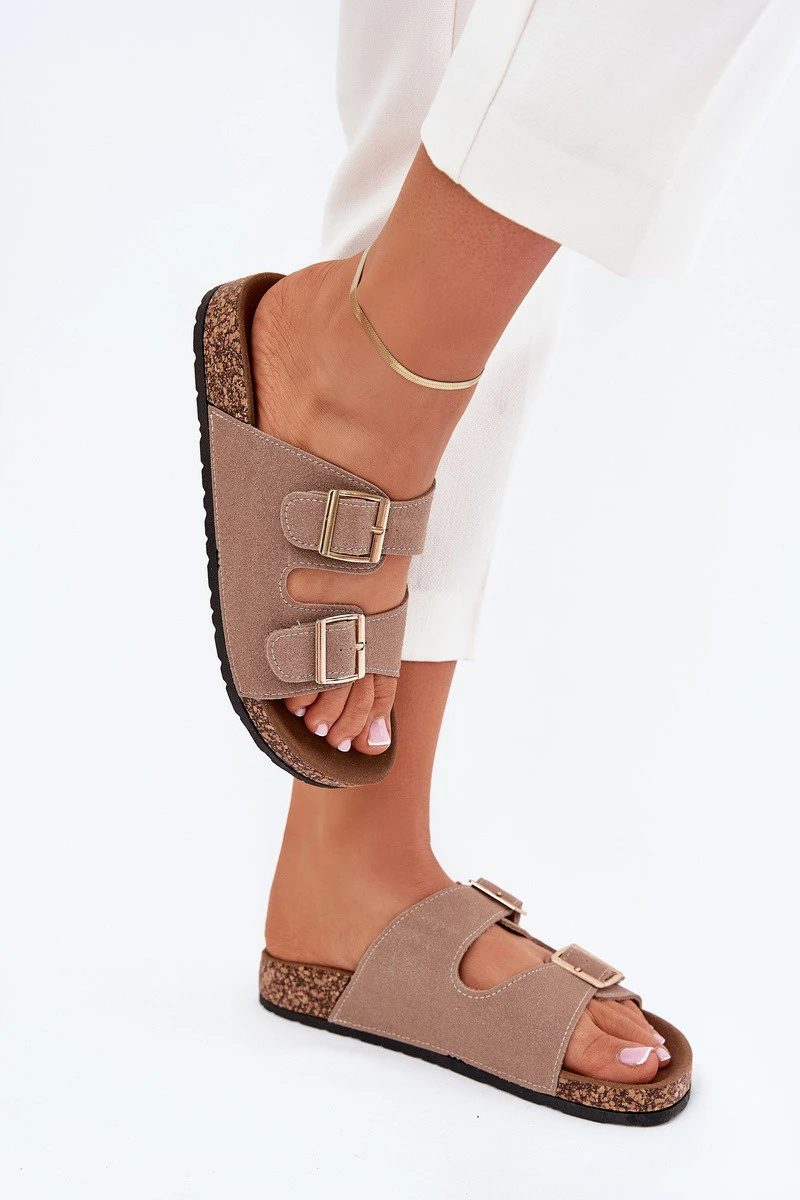 Dámské pantofle z eko semiše, umístěné na korkové platformě, jsou kombinací stylu a pohodlí. Dvě zlaté spony s nastavitelnými pásky umožňují dokonalé přizpůsobení k noze, a profilovaná stélka zajišťuje komfort po celý den. Ideální pro letní stylizace, skvěle se hodí k šatům, sukním nebo šortkám. Při výběru velikosti se řiďte tabulkou velikostí.