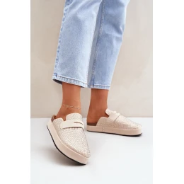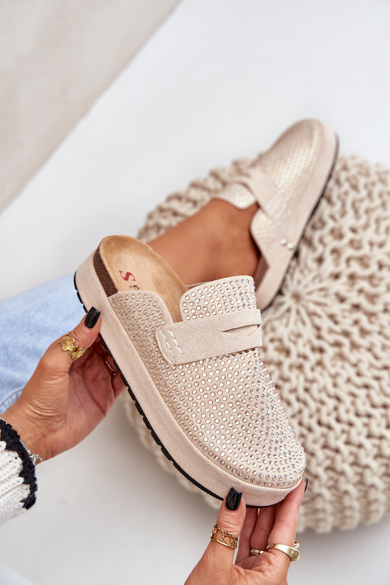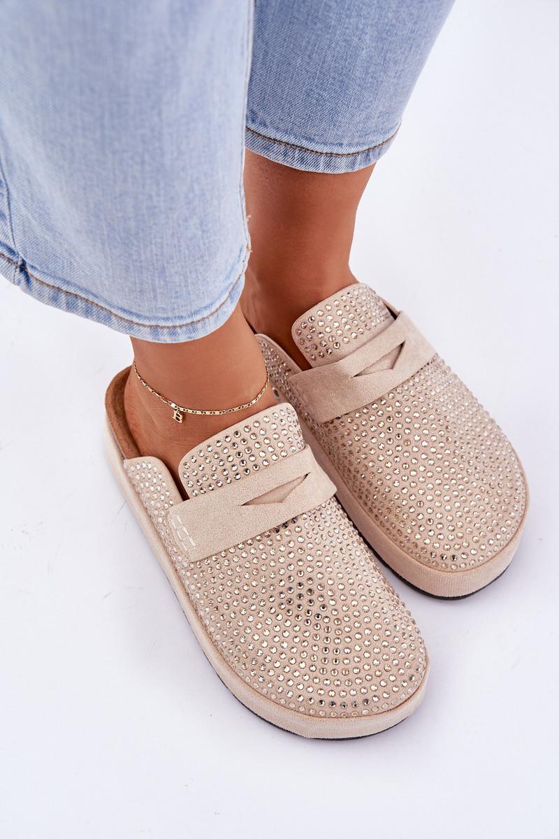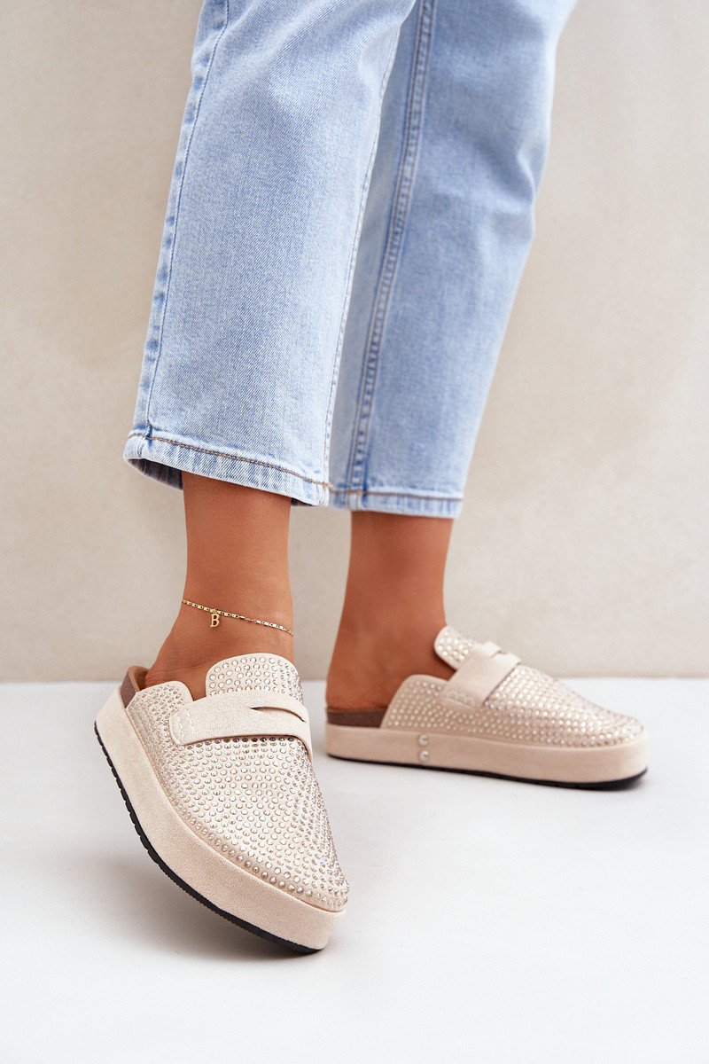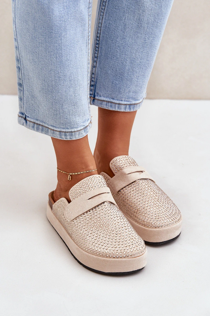 Dámské pantofle z eko semiše. Umístěny na platformě. Tento model se vyznačuje mnoha zirkony, které dodávají lesk každé stylizaci. Zakryté, zaoblené špičky. Lehce profilovaná stélka zajišťuje pohodlí. Stylový model, který jistě doplní mnoho letních stylizací! Při výběru velikosti se řiďte tabulkou velikostí.