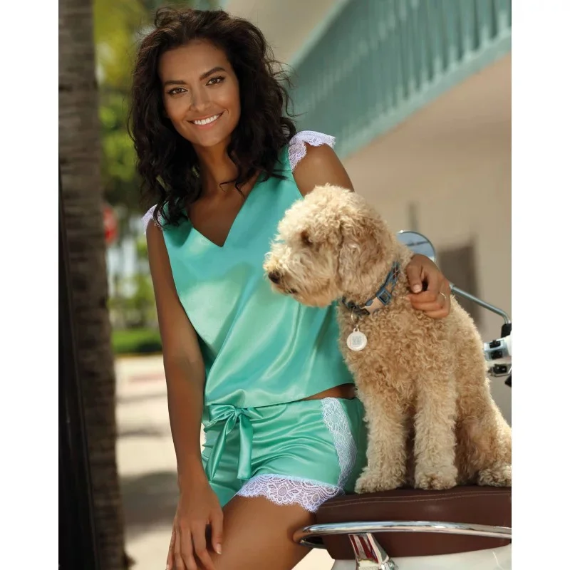 Nádherná akvamarínová sada zakončená jemnou bílou krajkou. Jemný výstřih, krajka padající na ramena, jemná na dotek. Kraťasy s gumičkou, zakončené bílou mašlí. Velmi ženské pyžamo s jedinečnou barvou, která vyhovuje jakémukoli typu krásy.