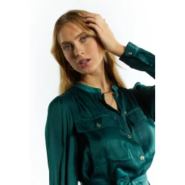 Saténové dámské šaty s délkou pod kolena. Šaty se stojáčkem ve výstřihu, dlouhými rukávy a zavazováním v pase, které dokonale zvýrazní postavu. Šaty zdobí dvě kapsy s klopou na přední straně. Tento model je ideální pro každodenní použití i pro zvláštní příležitosti. Modelka na fotografii měří 177 cm a nosí velikost 36.