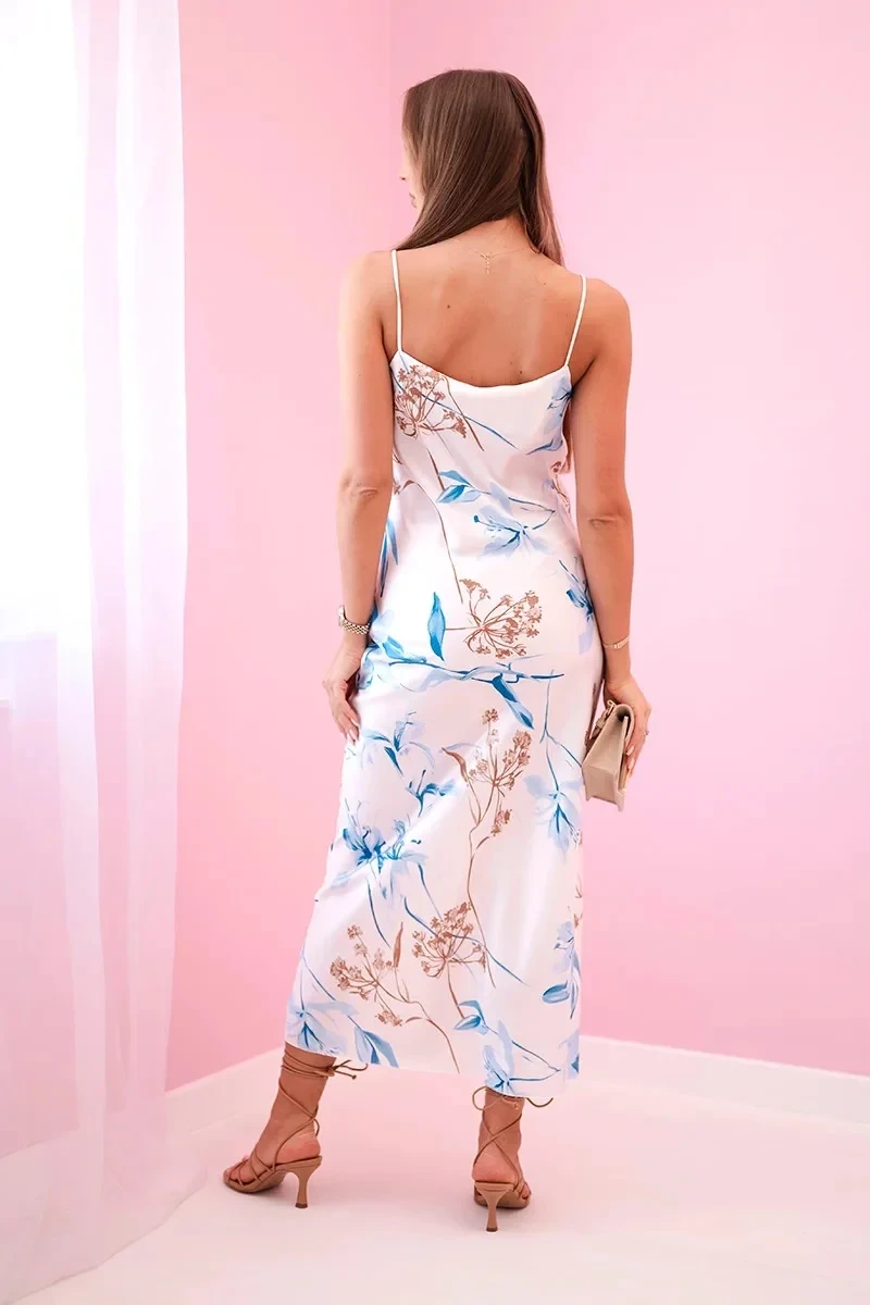 Luna - elegantní dlouhé dámské saténové maxi šaty s rozparkem na noze, velkým výstřihem a s překříženými ramínky na zádech.