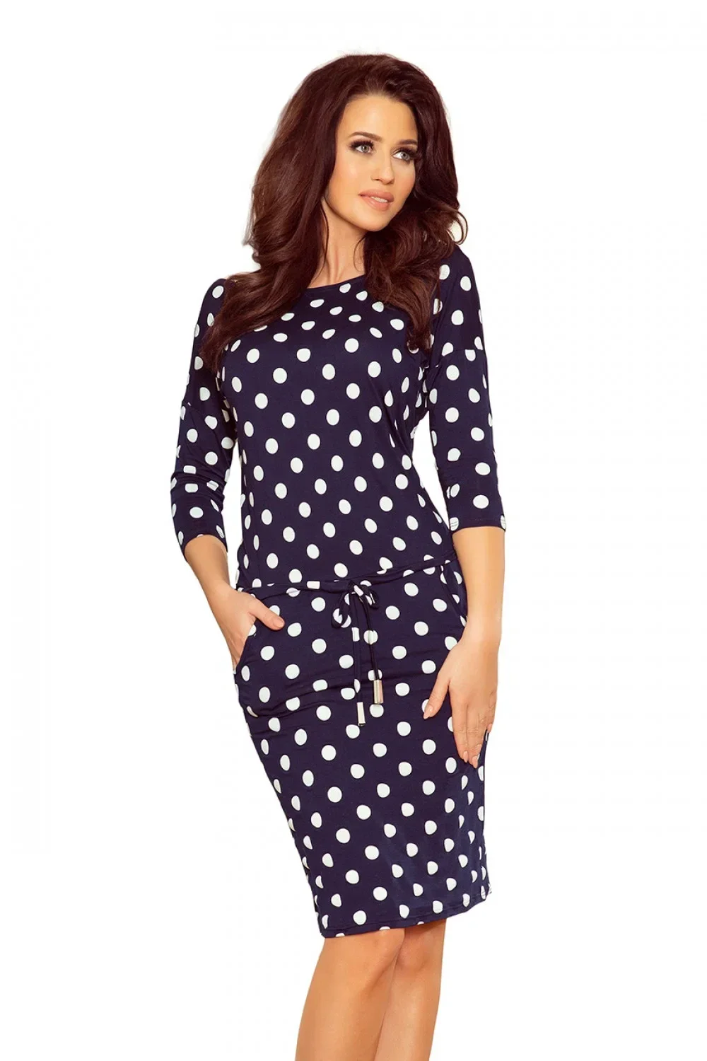 Sportovní modré šaty 13-101 Numoco s bílými puntíky - kulatý výstřih - tříčtvrteční rukávy - šaty mají volnější střih - v pase je v tunýlku vložena širší gumička a šňůrka se stříbrnými korálky - délka nad kolena (v závislosti na výšce postavy)