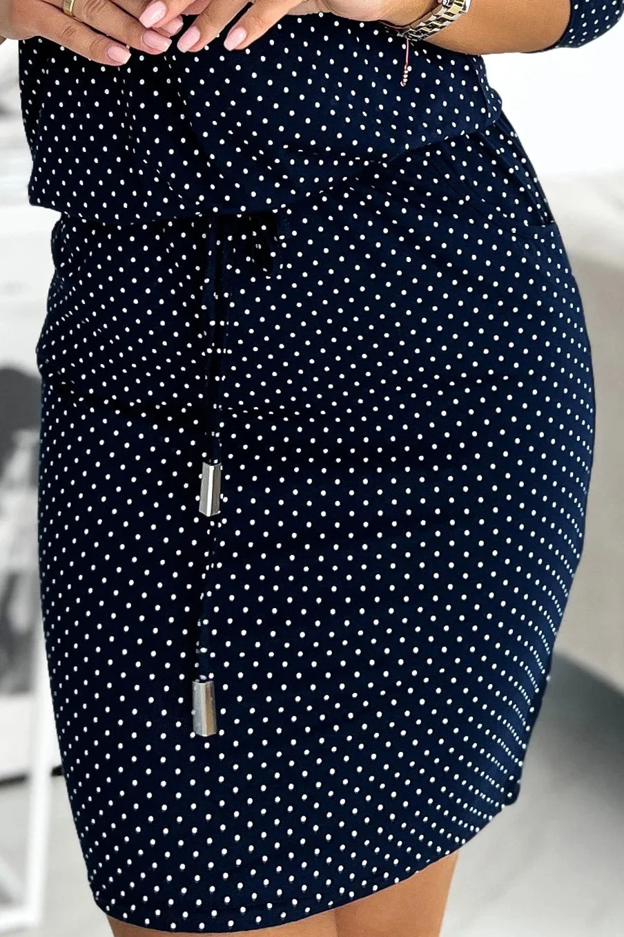 Dámské šaty 13-147 NUMOCO - tmavě modrá barva - kulatý výstřih - tříčtvrteční rukávy - šaty mají volnější střih - v pase je v tunýlku vložena širší gumička a šňůrka se stříbrnými korálky - délka nad kolena (v závislosti na výšce postavy)