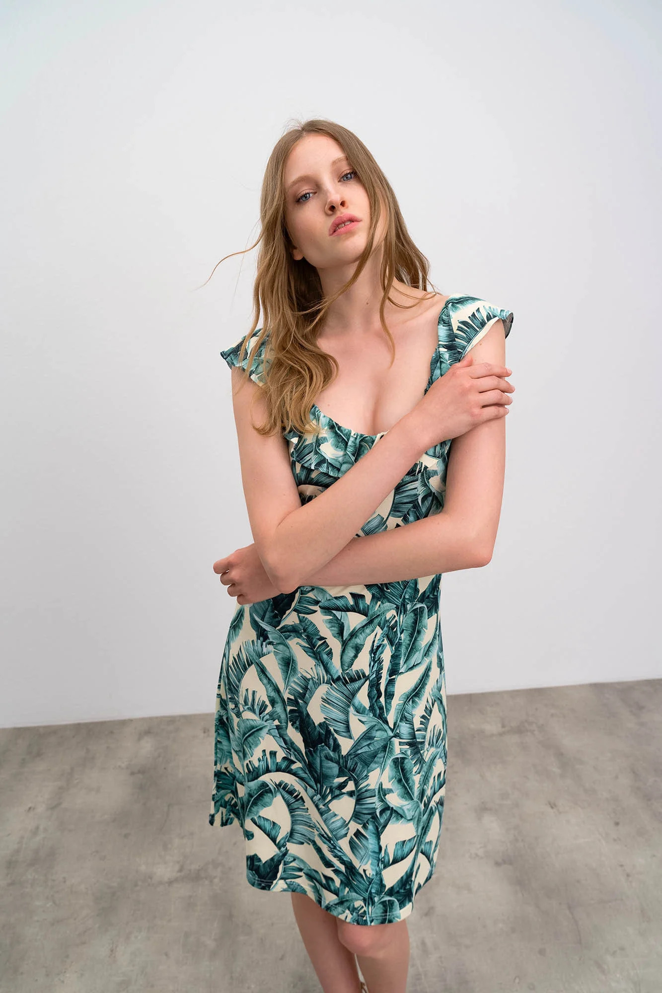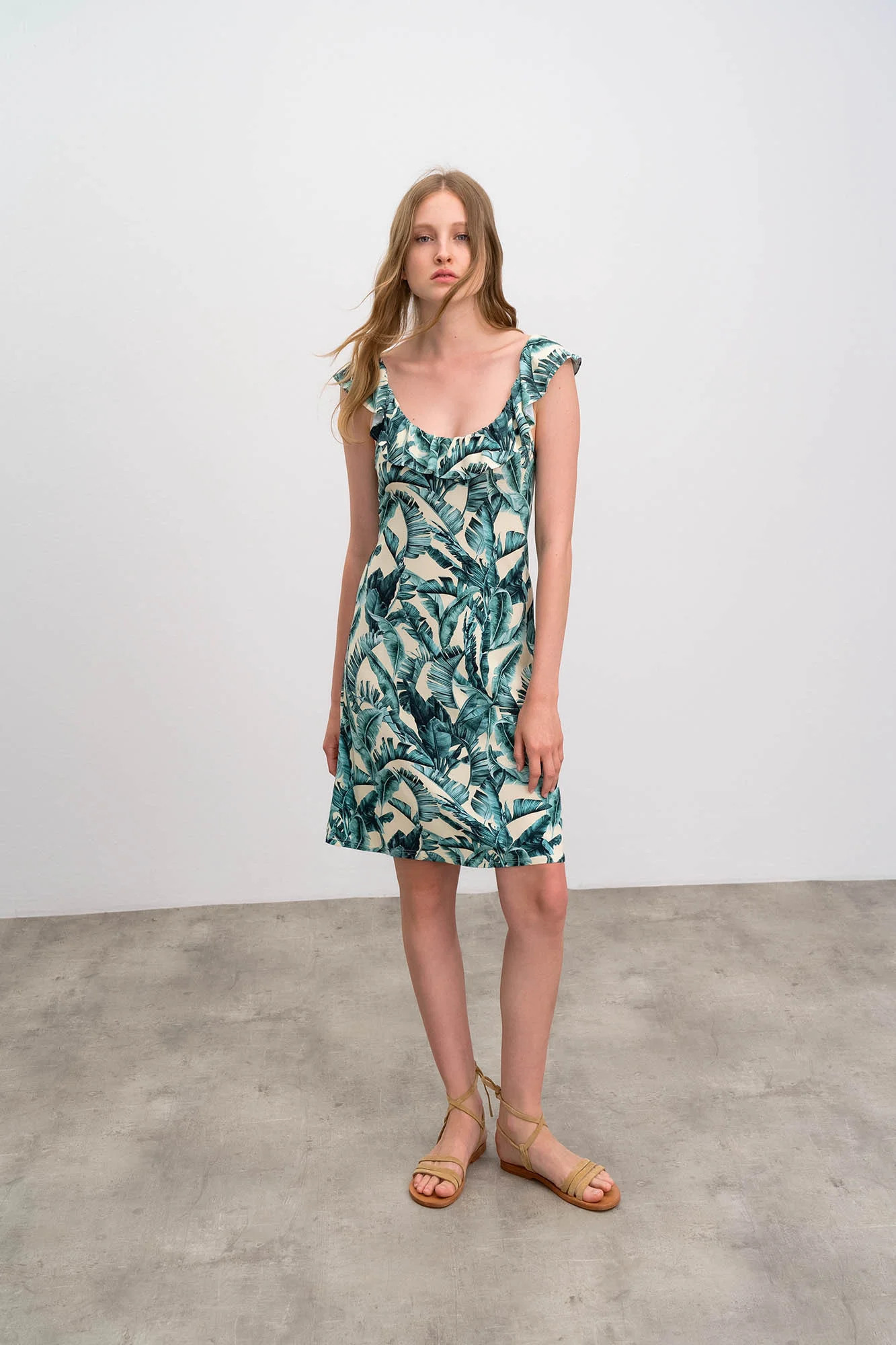 Elegantní dámské šaty s motivem listů s kulatým zřaseným volánovým výstřihem, vše co žena v parných letních dnech potřebuje. Šaty jsou vyrobené z kvalitní jersey viskózy s příměsí elastanu. Jersey Viscoza se vyznačuje vysokou savostí, je dobře prodyšná, měkká a příjemná na dotek a elastan zaručuje lepší pružnost tkaniny.