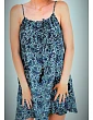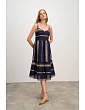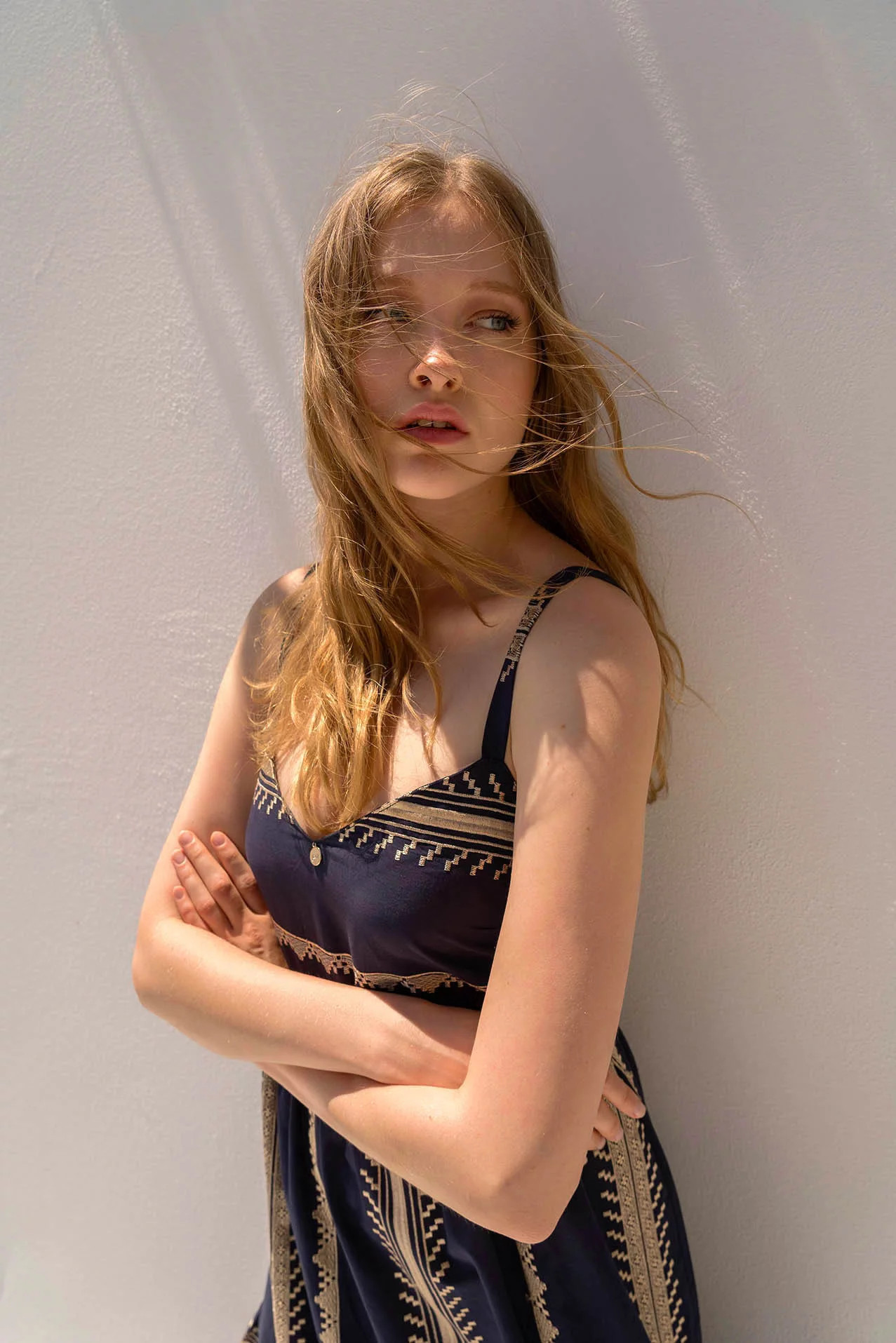 Elegantní tmavěmodré dámské šaty na ramínka se zlatou vyšívkou a výstřihem do V. Šaty jsou vyrobené z velmi lehké bavlněné látky Voile, která je mimořádně jemná na dotek a příjemně chladivá. Ideální pro teplé letní dny.
