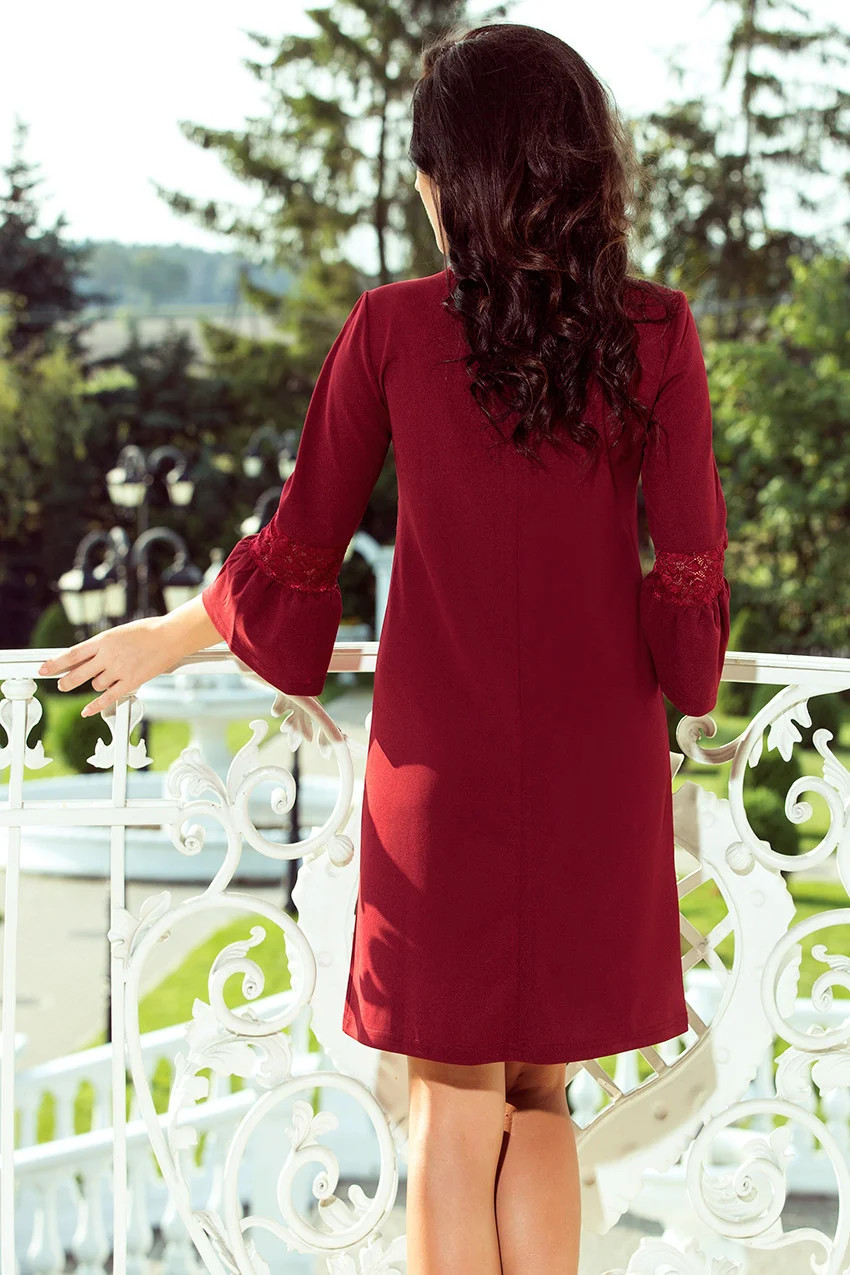 Dámské šaty 190-8 MARGARET NUMOCO - bordó barva - z vysoce kvalitní tkaniny s krajkou - s kulatým výstřihem - široké rukávy s krajkovými vložkami - velmi pohodlné