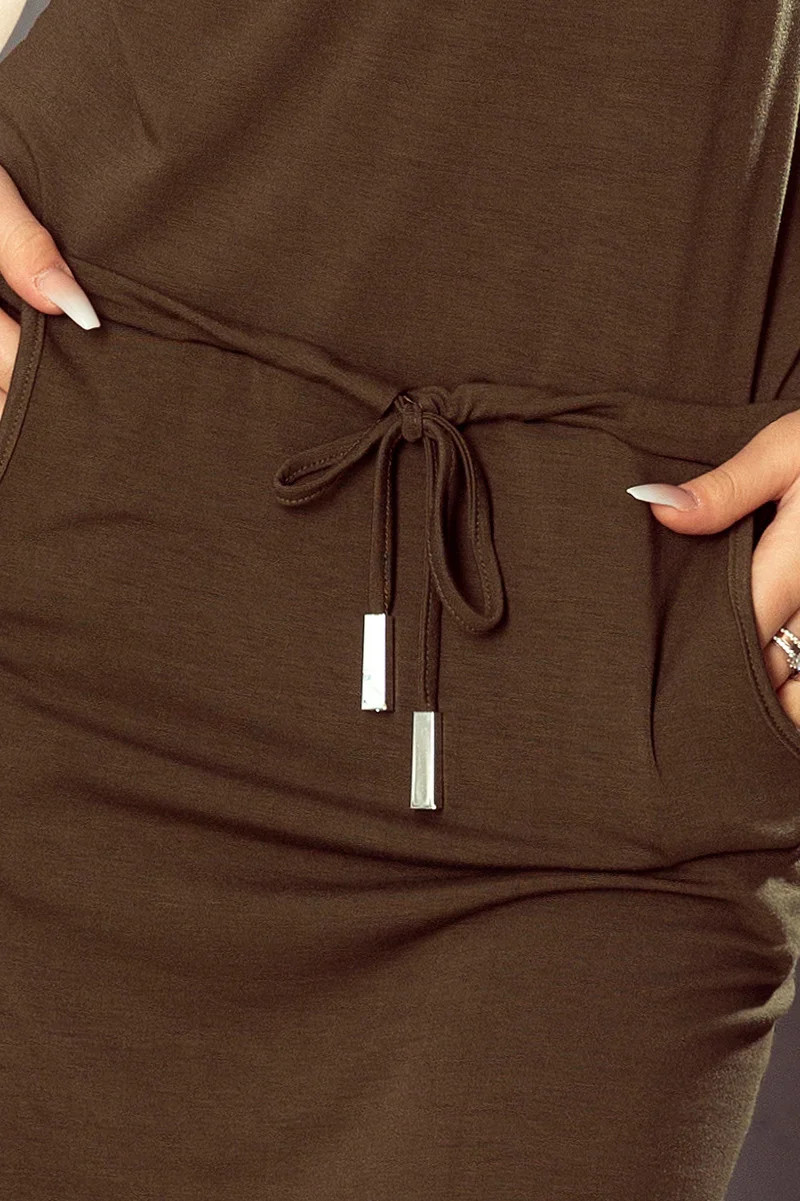 Dámské šaty 196-2 NUMOCO - khaki barva - z vysoce kvalitní tkaniny - s krátkými rukávy - s kulatým výstřihem - se dvěma funkčními kapsami na předním díle - mají v pase stahovací šňůrku