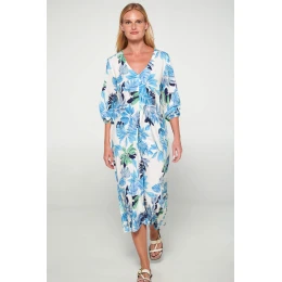 Produkt Dámské šaty 20417 Ecru s modro zelenou potisk - Vamp prodáváme v těchto velikostech: 3XLa barvách ecru s potiskem5210125279662