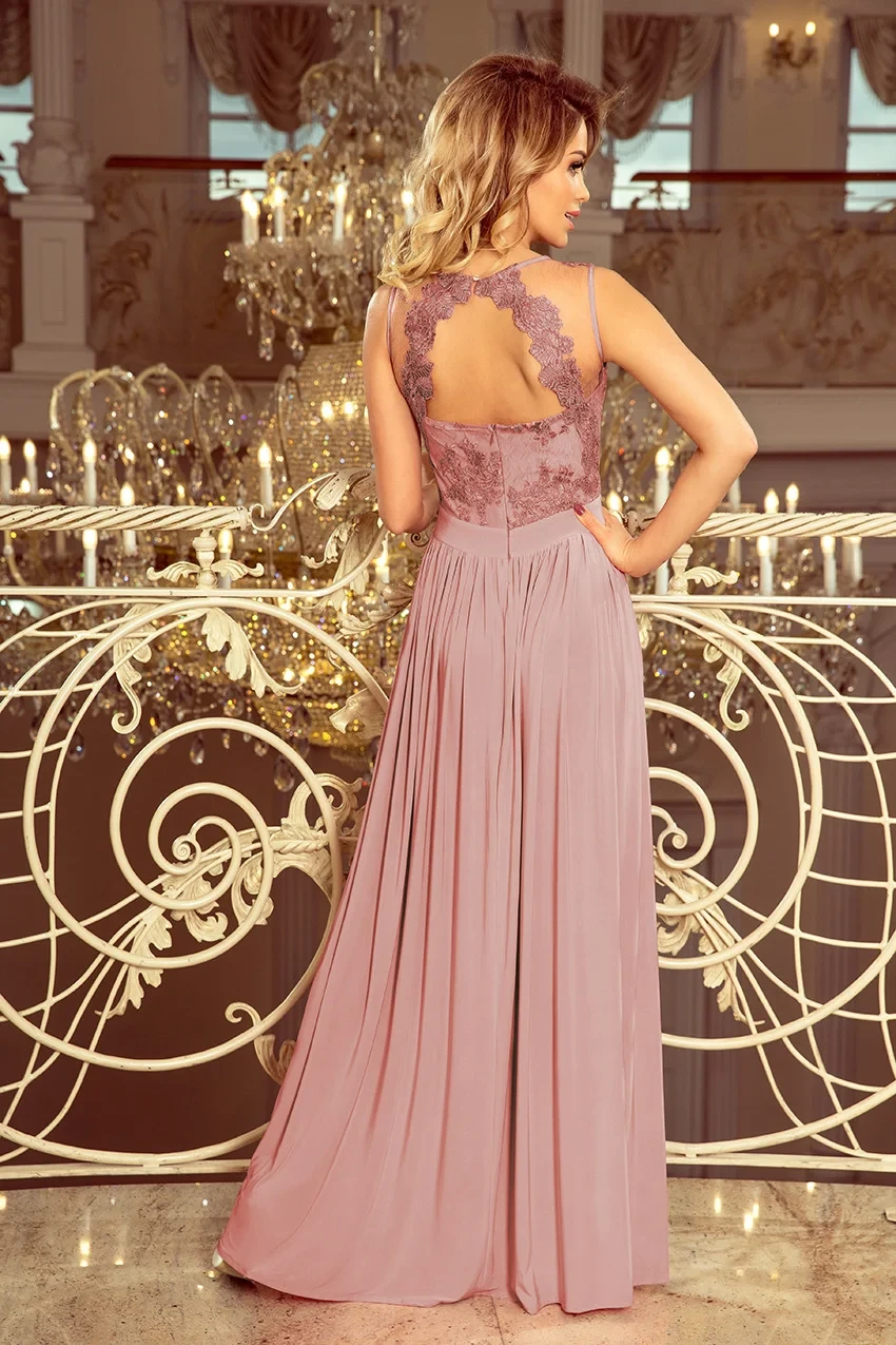 Dámské šaty 215-5 LEA NUMOCO - starorůžová barva - dlouhá skládaná sukně s rozparkem - horní část bez rukávů s výšivkou - odhalená zádaMateriálové složení: 95% polyester + 5% elastan