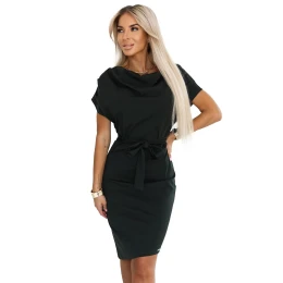 Dámské šaty 240-7 ROXI NUMOCO - khaki barva - krátké rukávy - asymetrická sukně - pásek na zavazování - délka šatů sahá ke kolenům