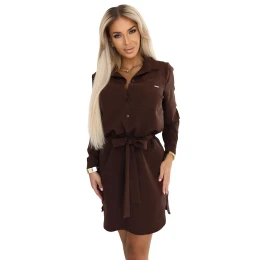 Dámské šaty 284-5 CAMILLE NUMOCO - čokoládová barva - košilového typu - límeček a zapínání na knoflíky - dlouhé rukávy zakončené manžetami s knoflíčkem - s kapsami - na zavazování