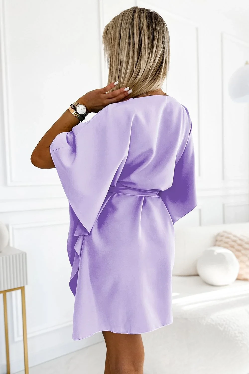 Dámské šaty 287-29 SOFIA NUMOCO - světle fialová barva - volnějšího střihu "motýl" - tříčtvrteční rukávy - v pase na zavazování - délka ke kolenůmMateriálové složení: 95% polyester + 5% elastan