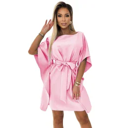 Dámské šaty 287-30 SOFIA NUMOCO - pudrově růžová barva - volnějšího střihu "motýl" - tříčtvrteční rukávy - v pase na zavazování - délka ke kolenům
