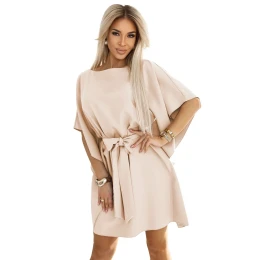 Dámské šaty 287-38 SOFIA NUMOCO - béžová barva - volnějšího střihu "motýl" - tříčtvrteční rukávy - v pase na zavazování - délka ke kolenům