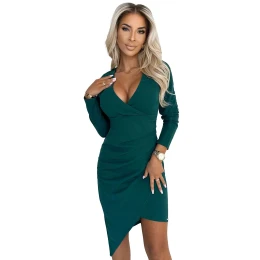 Dámské šaty 290-3 NUMOCO - zelená barva - z lehce elastického materiálu - asymetrický střih - otevřený dekolt - s řasenímMateriálové složení: 95% polyester + 5% elastan