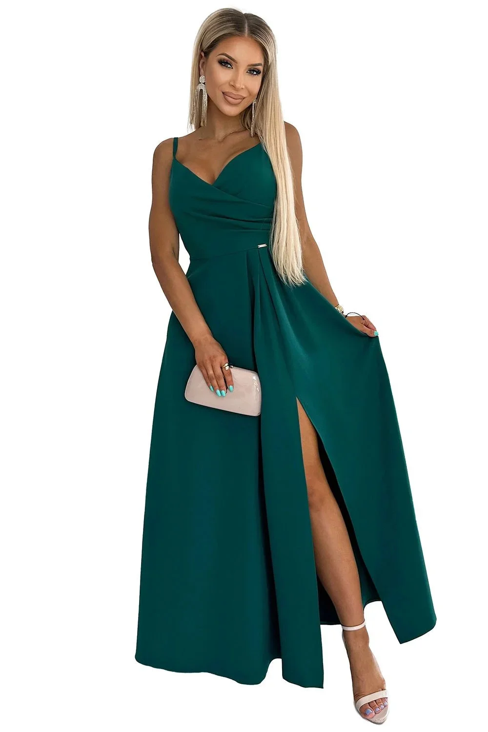 Dámské šaty 299-11 Numoco - s tenkými ramínky - vyprofilovaný dekolt - maxi sukně s rozparkem