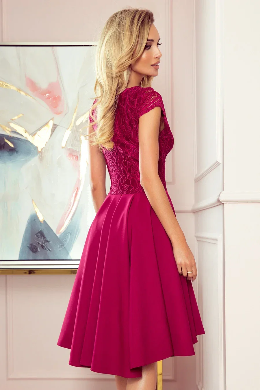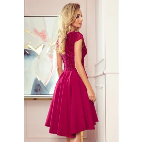 Dámské šaty 300-4 Patricia NUMOCO - bordó barva - zdobený výstřih ve tvaru V, který zdůrazňuje dekolt - horní část zdobená krajkou - dvouřadá volánová sukně dělá z modelu velmi elegantní kousek - ideální pro vzácnou příležitost