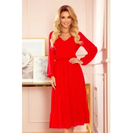 Dámské šaty 304-3 NUMOCO - červená barva - výstřih do tvaru "V" - s dlouhými šifónovými rukávy - spodní okraj zakončený šifónovým volánkem