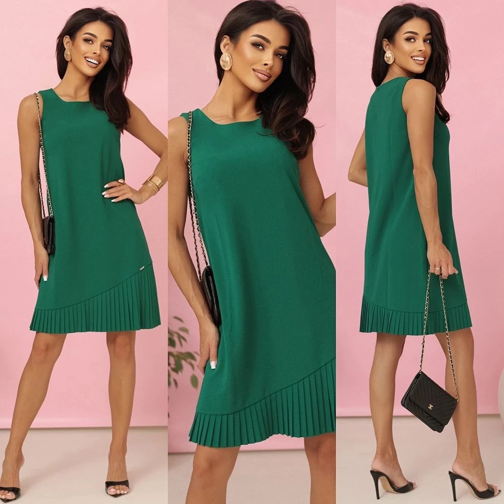 Dámské šaty 308-4 KARINE NUMOCO - zelená barva - trapézové šaty - asymetrický střih - široká ramínka - ve spodní části řasení
