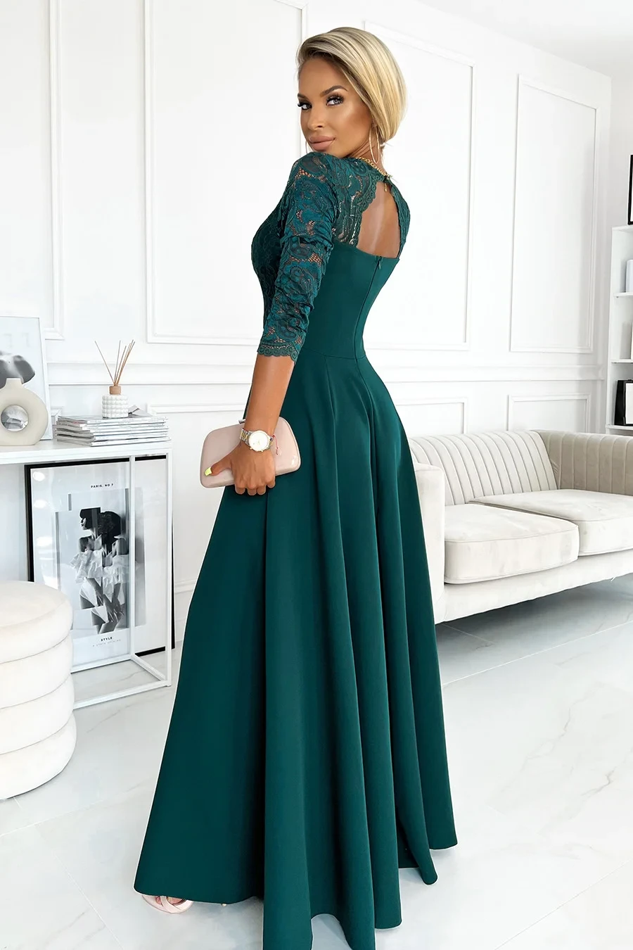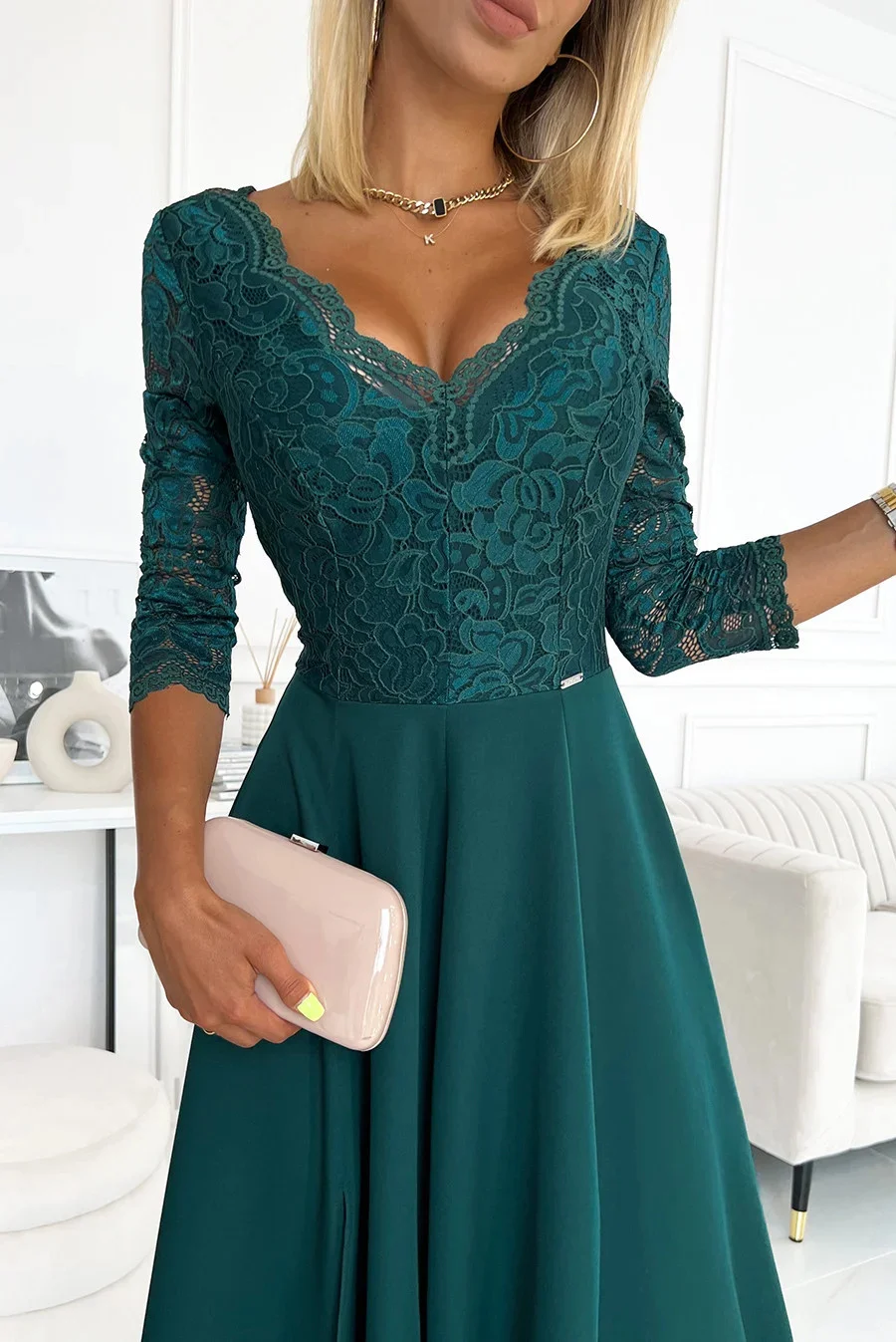 Dámské šaty 309-5 Amber NUMOCO - zelená barva - elegantní střih - tříčtvrteční rukávy - krajkové šaty s výstřihem - s rozparkem